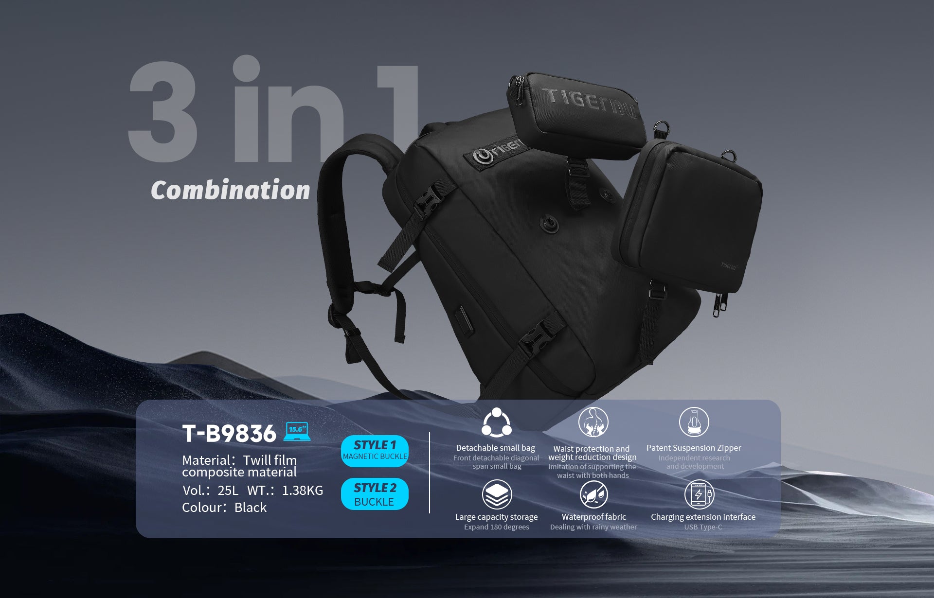 Tigernu Multi Functional Expansion Compartment, USB Waterproof and Breathable Honeycomb Back Panel, Nylon 3-in-1 Detachable Travel Bag